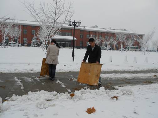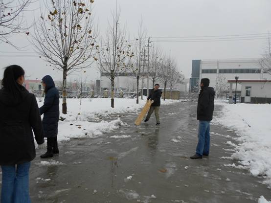 2011年11月29日,我市迎來(lái)2011年入冬以來(lái)的第一場(chǎng)大雪。轉(zhuǎn)眼間,大地已成白茫茫的一片。11月30日早晨,銀豐房地產(chǎn)公司和銀豐物業(yè)公司的員工早早來(lái)到公司,一起鏟除銀豐大廈周邊路面上的積雪。